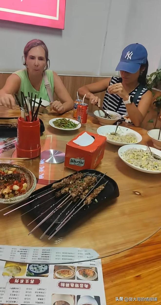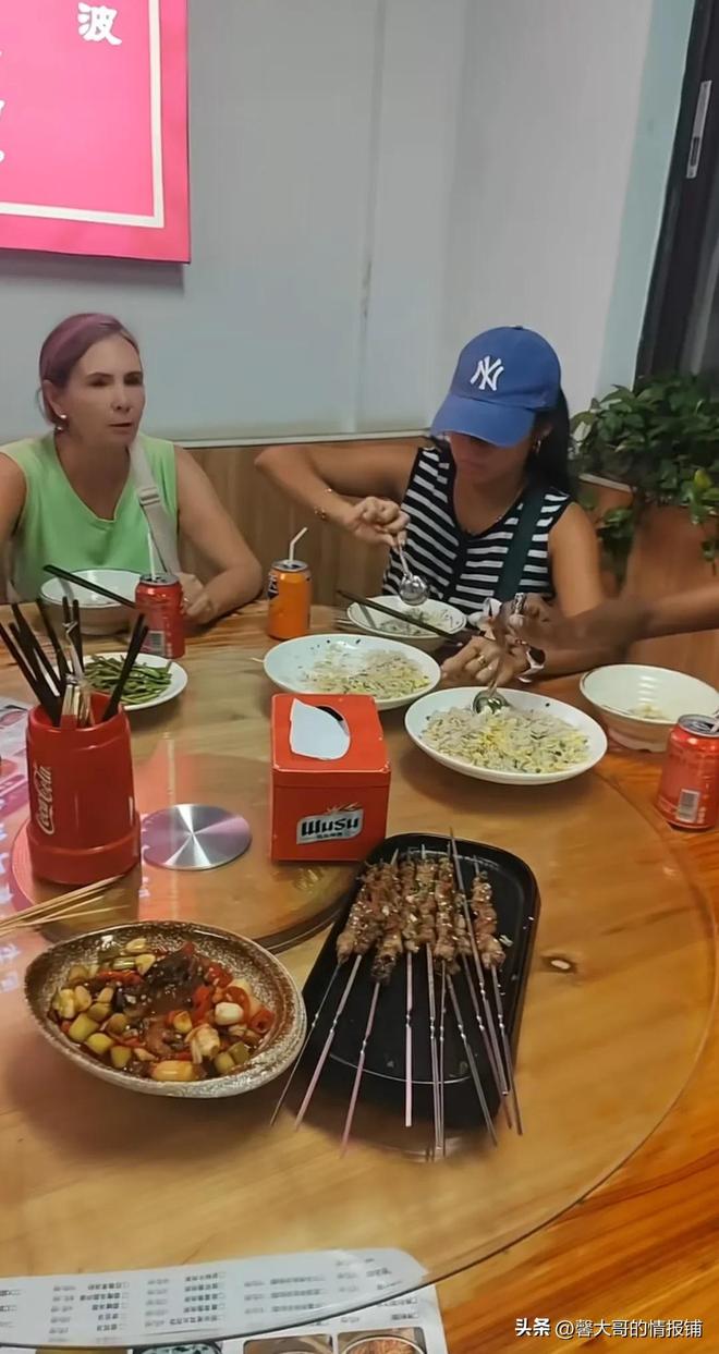 晚上,她们已到达南昌,在烧烤店吃烧烤,吃肉串,烧烤店老板很仗义,免单请客