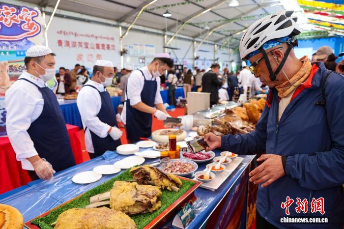 9月2日,“中华美食荟”青海家宴品鉴暨“拉面+骑行+文旅多业态融合”消费场景发布活动在青海省海北藏族自治州海晏县同宝山露营基地启幕。此次活动以“消费新场景 湖畔新美景——这么静,那么美,享在青海湖”为主题,以美食为窗口、生态为底色、融合为路径,深度呈现了青海服务消费的创新实践与丰硕成果。图为游客拍照记录青海家宴。中新社记者 薛蒂 摄