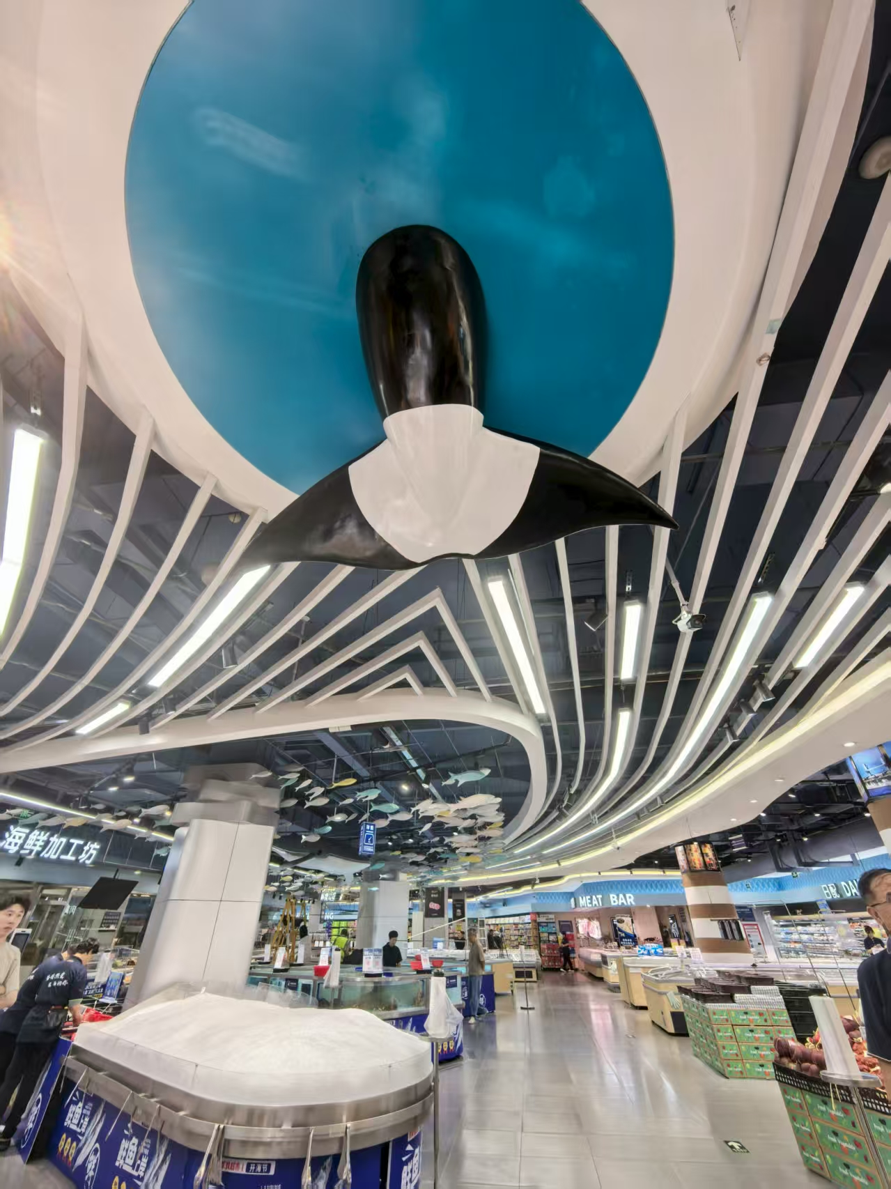 步入门店,首先映入眼帘的是以海洋为主题的开放式空间,让消费者宛如漫步在海洋世界。作为家家悦在济南市唯一一家海洋主题的门店,天花板上巨大的鲸鱼模型生动形象,彰显着动态美。小鱼群结伴而行,灵动地穿梭在海洋区域,为这“海底世界”增添了几分生机与活力,让消费者感受到来自大海的温柔拥抱。整个空间设计巧妙融合了购物与休闲的乐趣,让每一次光临都成为一次难忘的海底旅行。