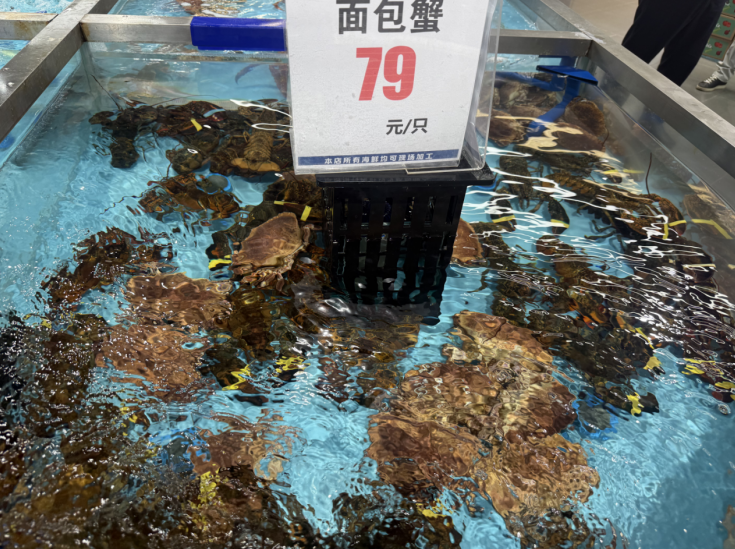 进入海鲜区,首先映入眼帘的是蟹类区域,大闸蟹张牙舞爪地挥舞着钳子,梭子蟹则安静地趴在水箱底部。鲤鱼、石斑鱼等在水中尽情地游动,彰显着活力与新鲜。波士顿龙虾宛如身披暗红铠甲的深海武士,静卧其间。海鲜种类齐全,商品也均明码标价,让消费者买得安心,买得放心。